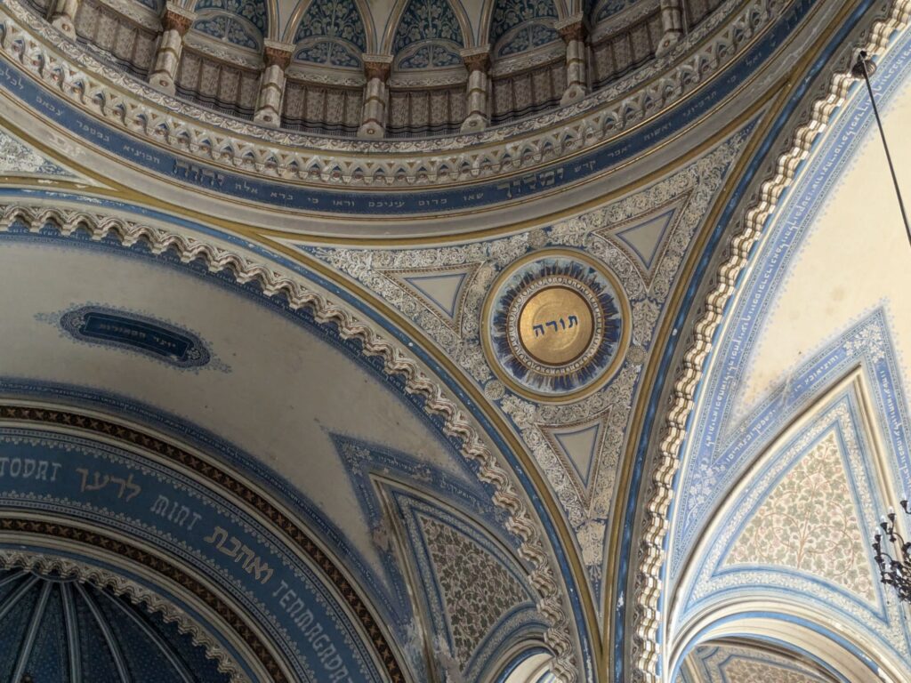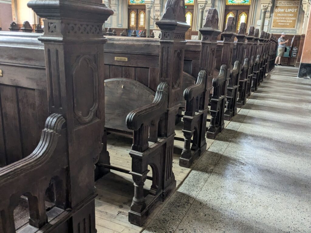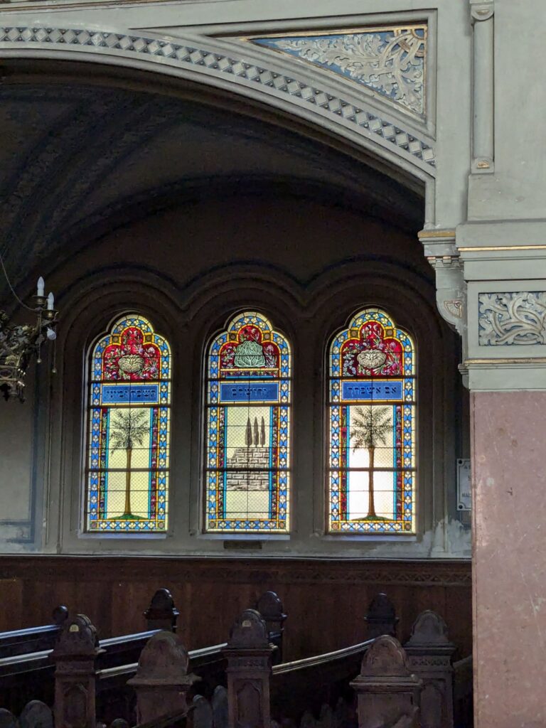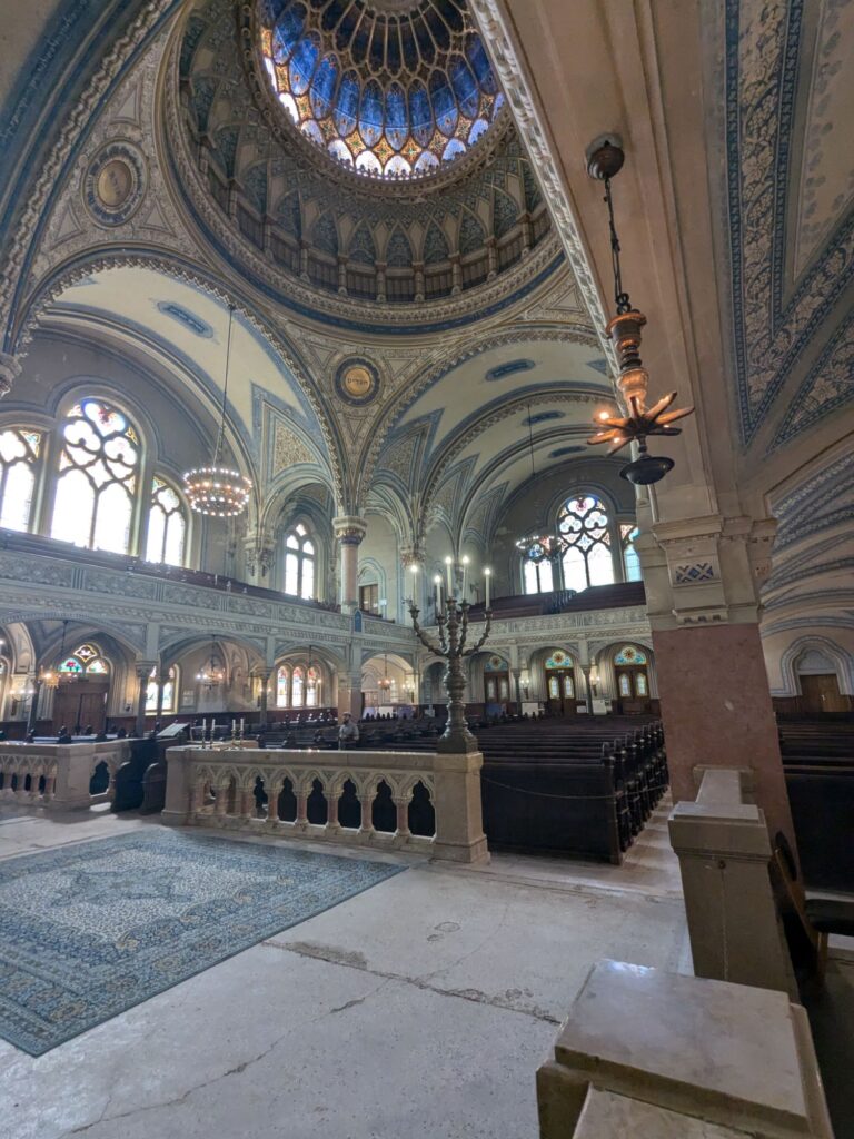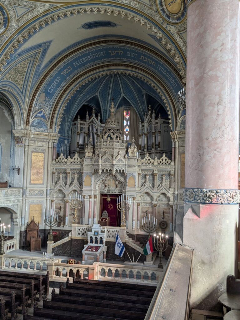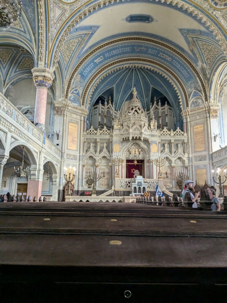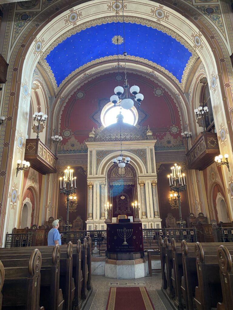 the dome of the synagogue is visible from far away. So, we knew where to head to on this really hot day in June. But we missed it and it took us detours and google maps to find it. A huge building, such huge buildings we saw only in Triest and in some places in Hungary. Impressive building, in moorish style. Inside it gives the feeling of being made out of wood, at least the colours give such an impression..