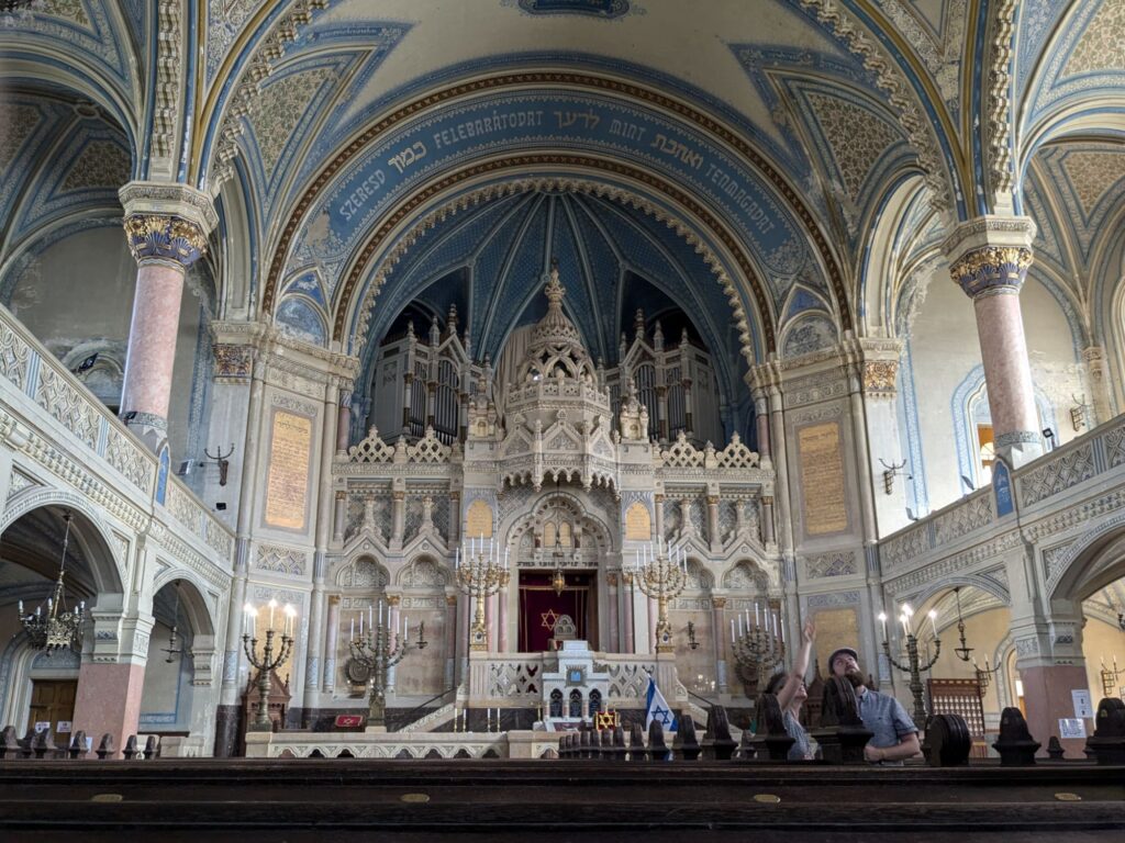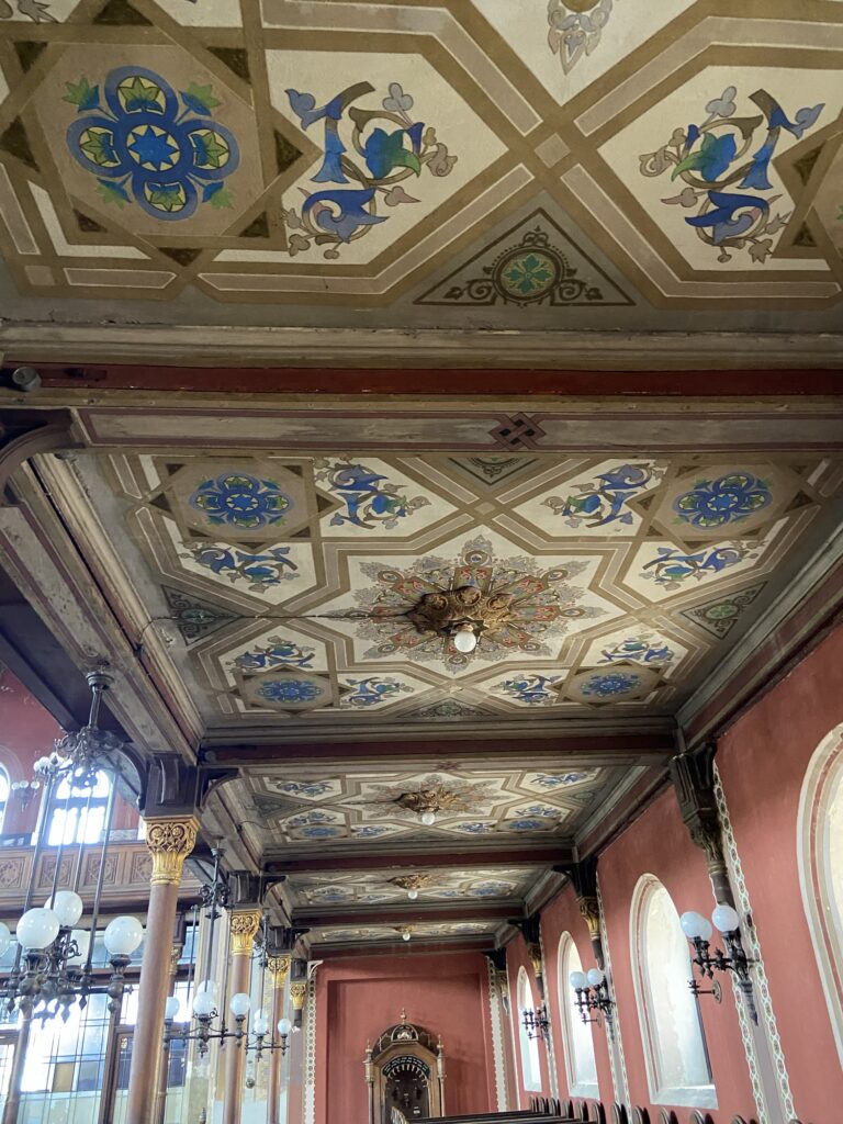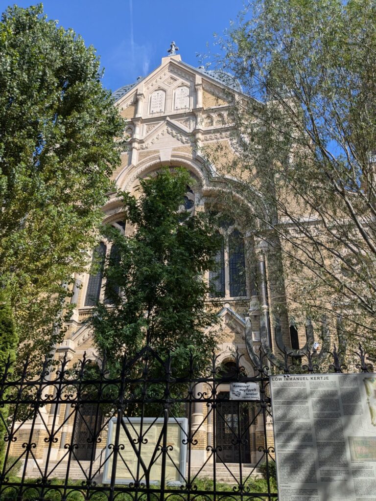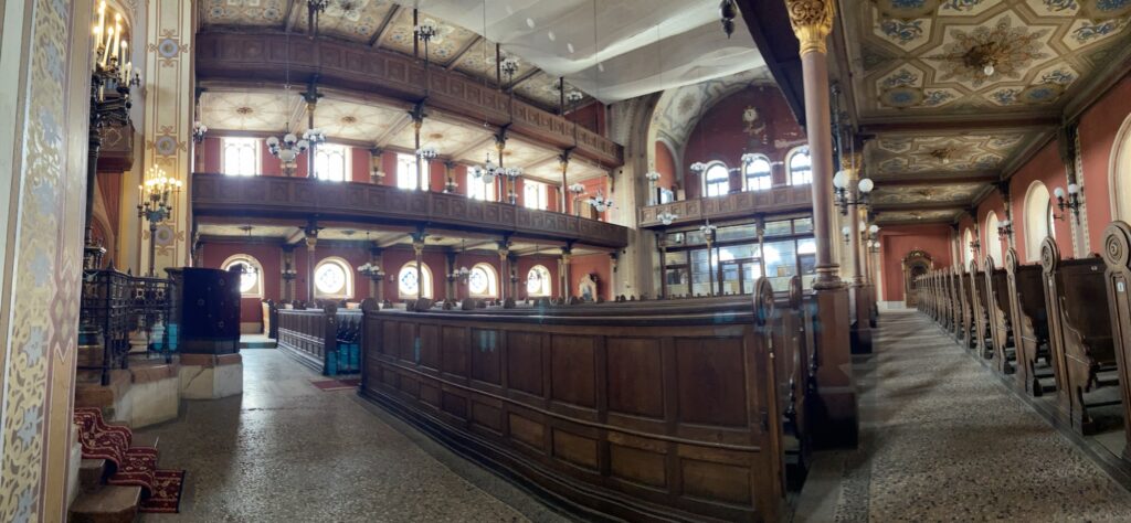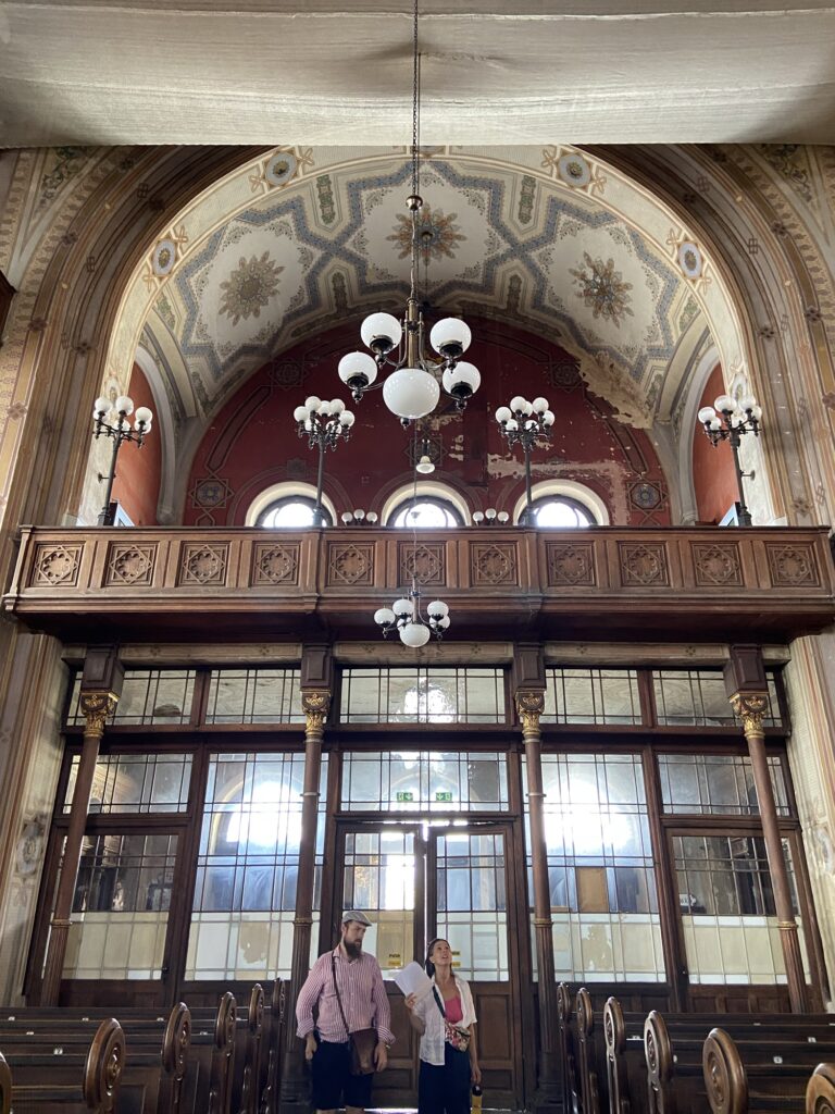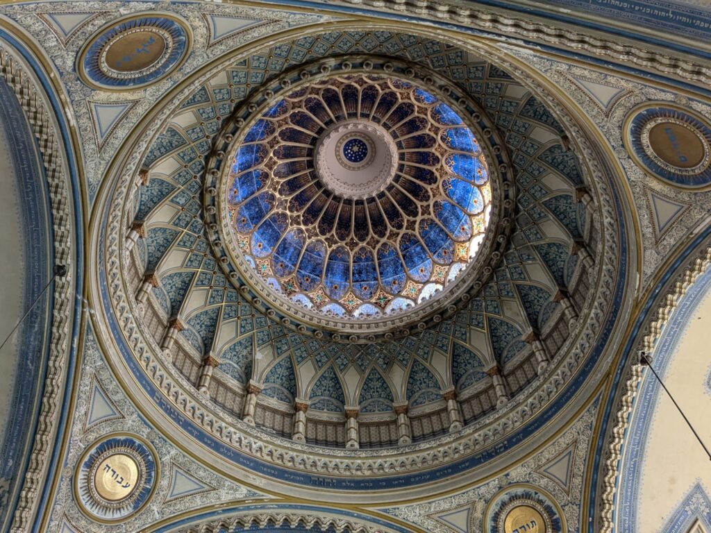 the dome of the synagogue is visible from far away. So, we knew where to head to on this really hot day in June. But we missed it and it took us detours and google maps to find it. A huge building, such huge buildings we saw only in Triest and in some places in Hungary. Impressive building, in moorish style. Inside it gives the feeling of being made out of wood, at least the colours give such an impression..