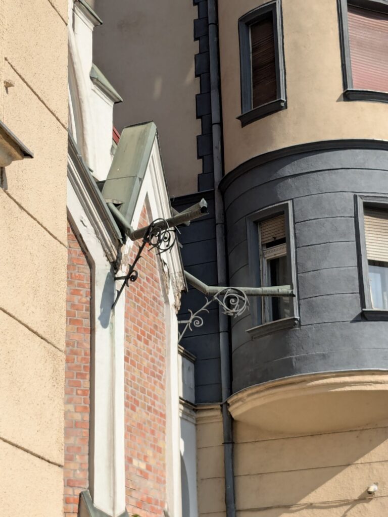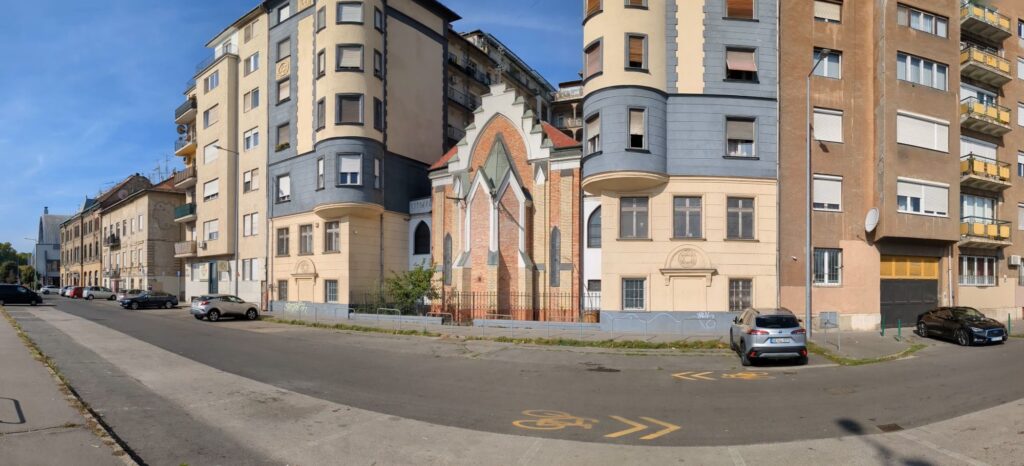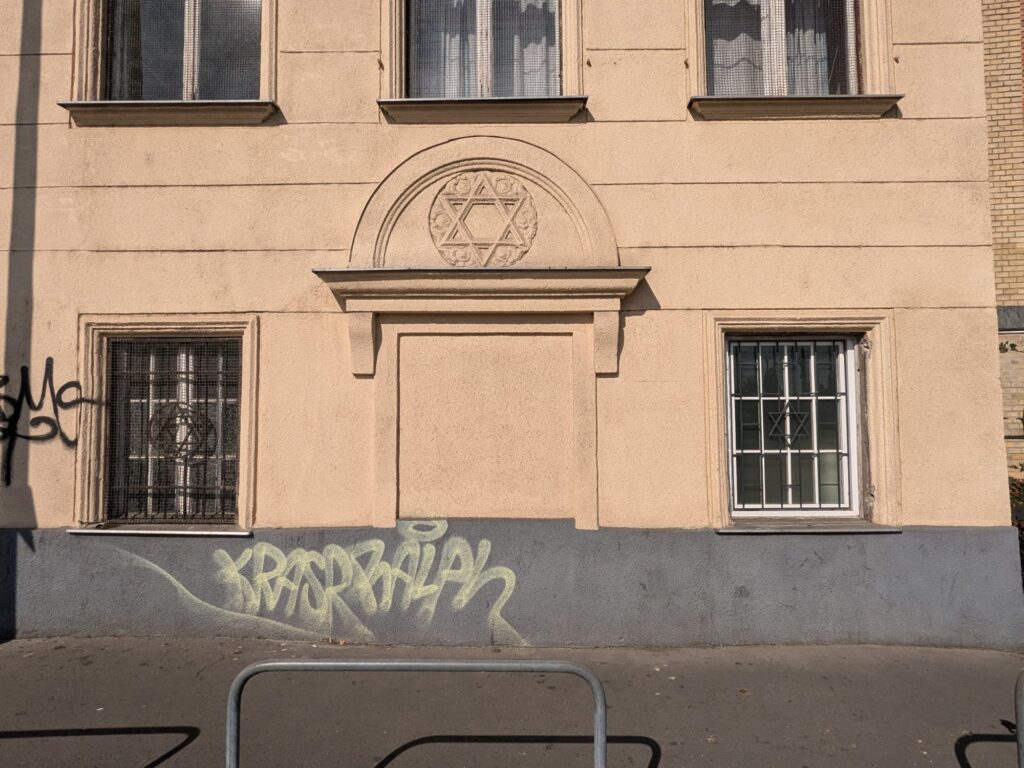 Embedded in houses, the synagogue is blending in. It is quite visible, that traffic is causing damage to the fasade. all grey or black. The street is not inviting- maybe because of construction areas.